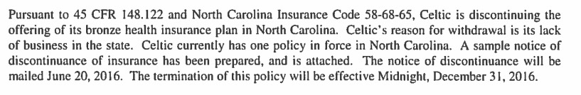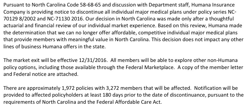 North Carolina's individual market, which only had 5 carriers participating to begin with this year, suffered a double blow recently when both UnitedHealthcare (155,000 enrollees) and Humana (3,272 enrollees) announced that they were dropping out of the market entirely next year (Celtic is also leaving the state, but they have literally just 1 person enrolled state-wide anyway). Fortunately, nature abhors a vacuum, so Cigna Health & Life Insurance decided to join the exchange for 2017. Cigna is already selling off-exchange individual policies, but only has fewer than 1,300 people enrolled in them at the moment. There's also a carrier called "National Foundation Life Insurance" which is raising rates 17.4%...but doesn't have a single person enrolled at the moment anyway, so I'm not sure what to make of that.