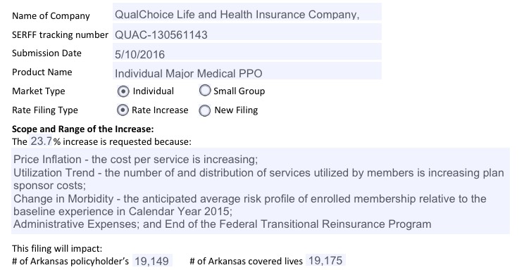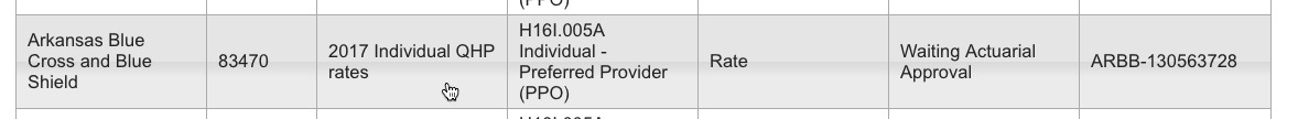 Arkansas was a little weird...while the rate filings for 5 carriers are listed over at RateReview.HealthCare.Gov, the carrier with the largest individual market share in the state, BCBS (aka "USAble Mutual") is nowhere to be seen (there's a sm. group listing for them, but not individual). However, when I went directly to the AR SERFF database, there they were--and it's listed specifically as "2017 Individual QHP Rates", so there's no question here about whether they plan on offering ACA-compliant policies in 2017.