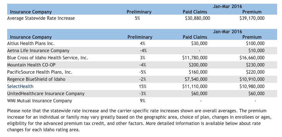 The Idaho insurance department website has made this really easy for me. Most states either don't provide the requested rate hikes at all (forcing me to track them down via a slew of SERFF filing forms) or, if they do provide the rate requests, they don't provide the actual enrollment numbers for each carrier, making it very difficult to run a weighted average.