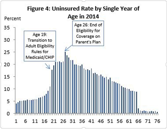 To illustrate this, here's a graph from CMS's "Young Adult Outreach" entry which shows the uninsured rate of everyone in the country by how old they are: