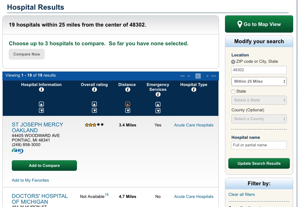 What I find most interesting about the Hospital Compare tool is that unlike the Rate Review and Plan Finder databases, this one is posted on the Medicare website. Nothing wrong with that, I suppose, I just found that decision noteworthy, and a bit odd from a branding/marketing POV, especially since HC.gov added the "Network Lookup" and "Formulary Lookup" tools last year. I was really figuring that HC.gov would become the one-stop source for all of these sorts of tools, which makes sense to me; everyone needs "Healthcare" whereas not everyone is on "Medicare".