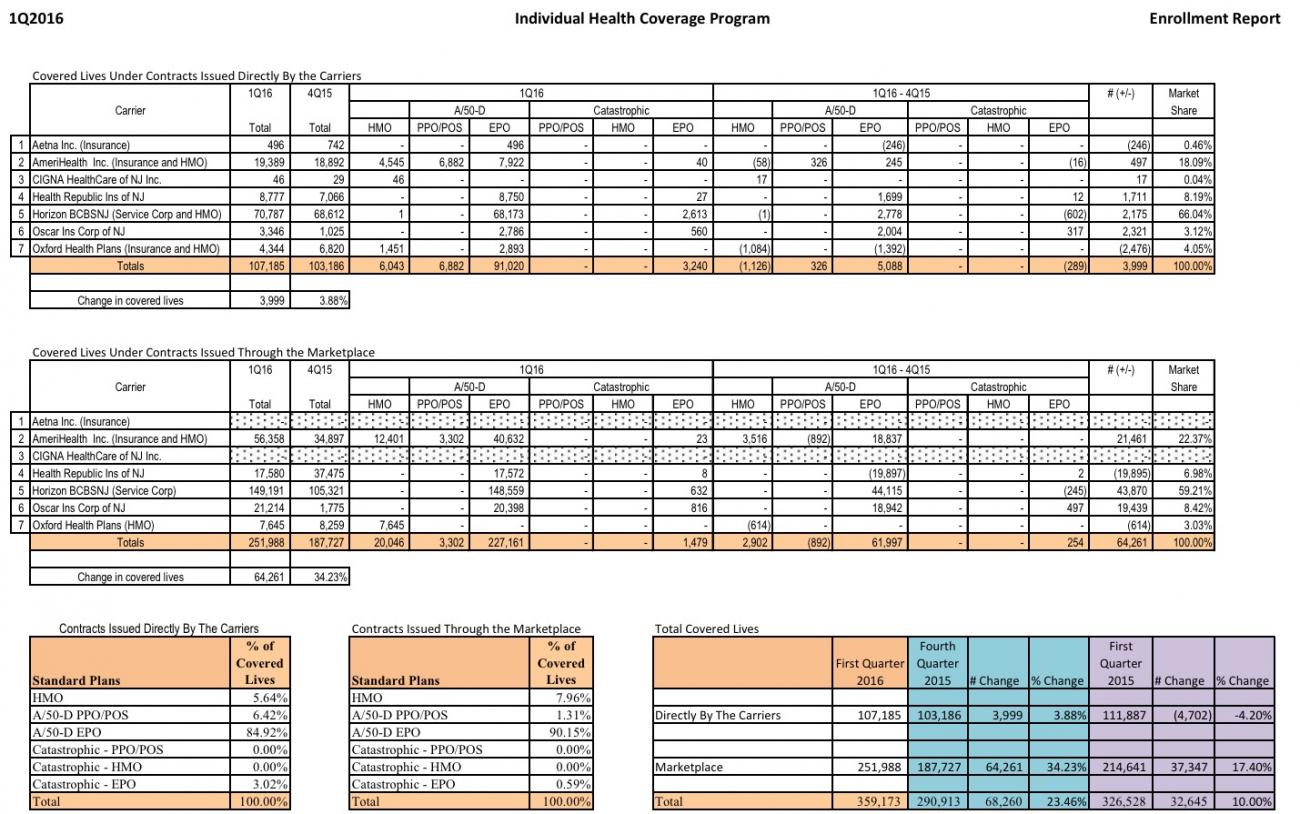 Fortunately, the New Jersey DOI does provide a pretty detailed quarterly report on the Individual Market Enrollment, including this one covering the First Quarter of 2016: