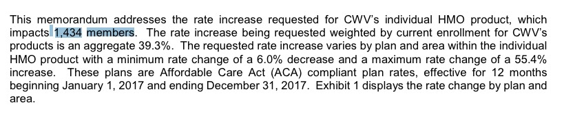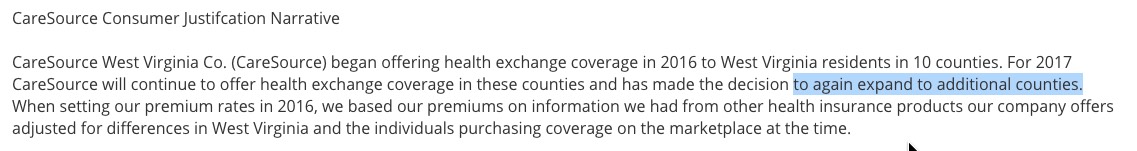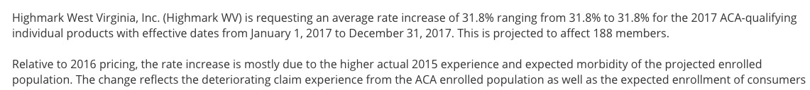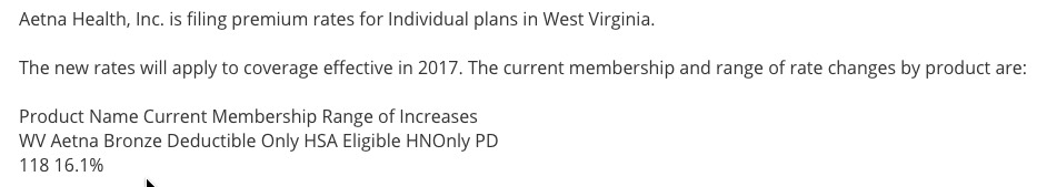 OK, this is irritating. Officially, all of West Virginia's 2017 rate filings have been submitted already, for 4 carriers (plus a fifth, "Freedom Life", which is more of a placeholder than anything). However, the official enrollment numbers for all of them only total around 1,700 people...compared to WV's total individual market size of at least 42,000 (in fact, 33.2K were enrolled in exchange-based policies as of the end of March).