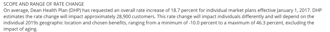 Wisconsin's total individual market was around 260,000 people in 2014 and is likely up to around 300,000 today (not including grandfathered/transitional enrollees), with about 224,000 enrolled on ACA exchange policies as of March 2016, plus an unknown number off-exchange. That means that the table below is likely missing around 1/3 of the total ACA-compliant market.