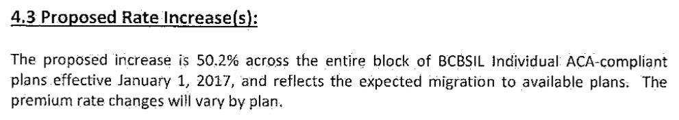 UPDATE: Ouch. As a couple of people called to my attention, while the individual listings for BCBSIL range from 23% to 45%, their actual average requested rate hike is higher yet: 50.2%. As ACA opponent Jonathan Ingram explained, the lower rates appear to include policies which are being cancelled, while the 50.2% figure includes those who are expected to be mapped to plans which will still be available. I've updated the table above to reflect this correction.