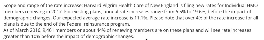 There are, however, a few caveats here: First, these reports don't include off-exchange enrollment, which could account for a substantial portion of the total for each carrier. Second, just because a certain number of people are enrolled in a carrier's exchange QHPs, that doesn't guarantee that all of that carrier's policies will be renewed. For instance, Harvard Pilgrim specifically states that "only 44% of renewing members" are in the plans included in the filing, or 9,461 people. Sure enough, when you tally up the numbers in the monthly report, there were a total of 19,326 people enrolled in Harvard Pilgrim QHPs as of July.