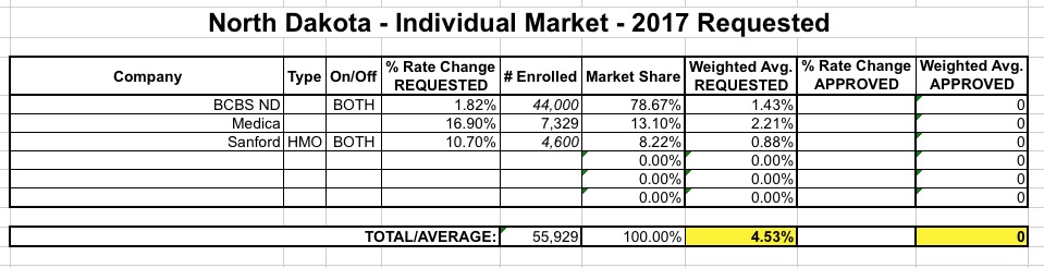 All of the above numbers are important when attempting to estimate the weighted average rate hikes requested by ND carriers, because of the 3 operating on the individual market (BCBS, Medica and Sanford), only one of them, Medica, has provided their actual 2016 enrollment tally (7,329).
