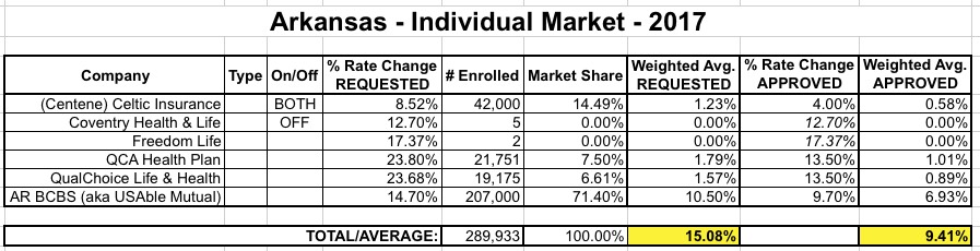 When I first crunched the numbers for Arkansas in early June, I estimated the average requested rate hike on the indy market at around 14.9%: