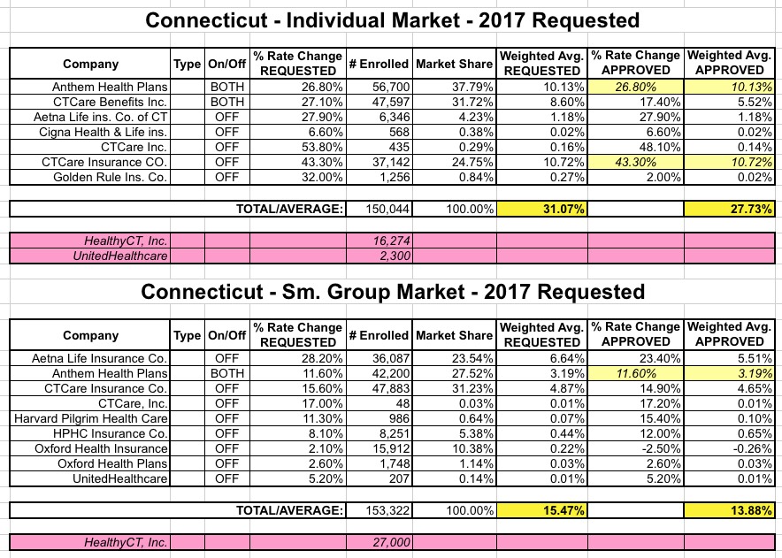 Also important: I have no idea where the CT Mirror came up with the "25% / 13%" averages. There's no way to get an approved average yet, and even if you strip out Anthem/CTCare from the indy market entirely, the average for the remaining carriers sits at 18.4%, not 25%. Weird.
