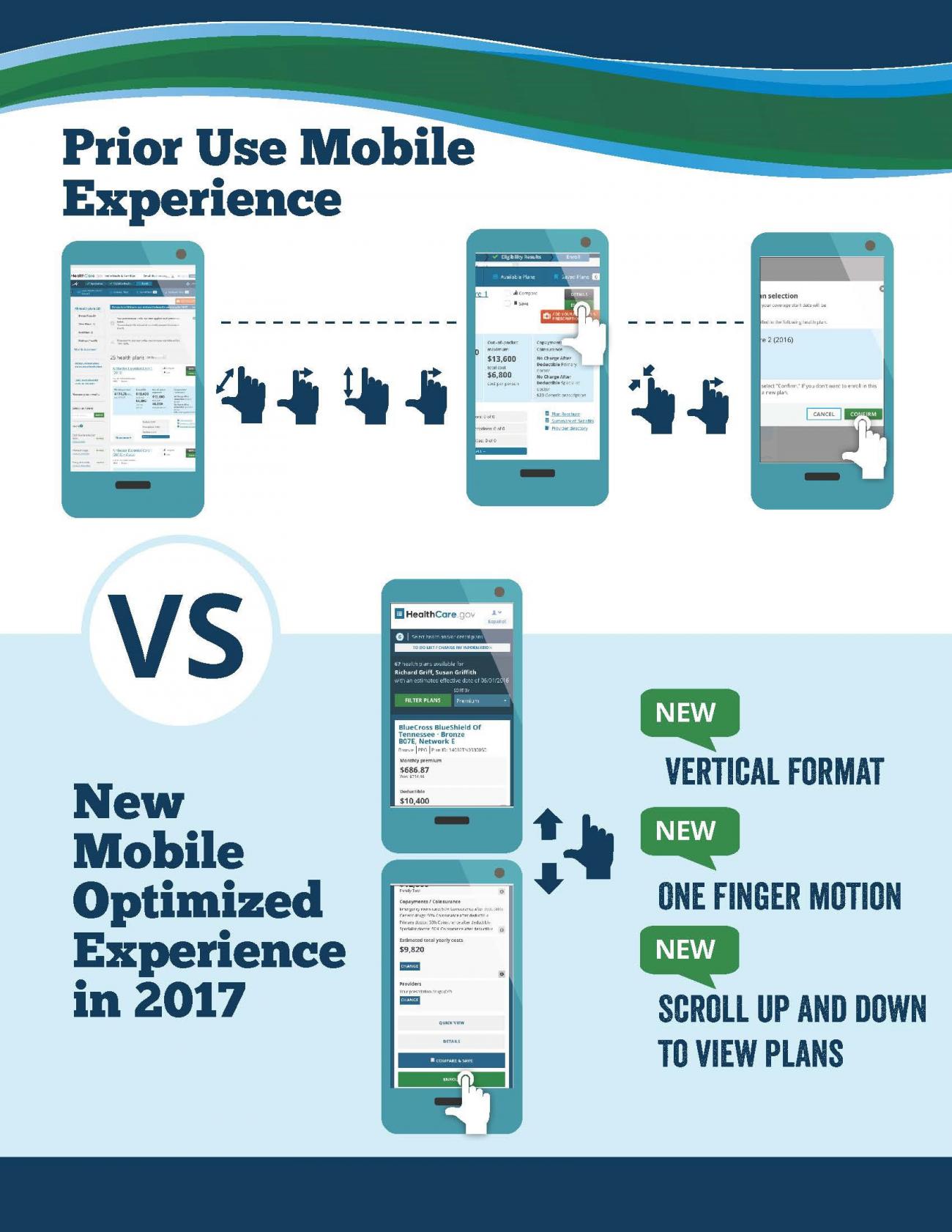 According to ComScore, 1 in 5 millennials access the internet exclusively through mobile devices. Last year, consumers could easily enroll in coverage at HealthCare.gov through mobile devices, but if they wanted to actually shop around and compare plans, the mobile interface could be difficult and time consuming. This year, consumers will find an end-to-end, mobile optimized experience, including a new state-of-the-art shopping process that for the first time offers improved ability to comparison shop on their phone or tablet. Rather than clicking on tiny boxes or zooming in on hard-to-read screens, consumers will now find intuitive navigation and a streamlined interface to compare plans.