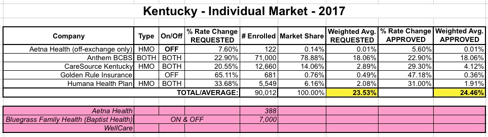 In other words, Baptist is dropping out of the entire individual market, both on and off-exchange. My last estimate of Kentucky's weighted rate hikes had Baptist down as only having around 1,100 individual enrollees, but it's possible that the other 5,900 were in plans which were being discontinued anyway.