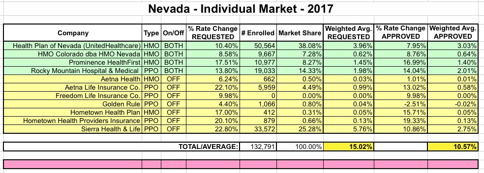 Nevada: Approved 2017 *unsubsidized* indy mkt rate hikes: 10.6% (vs. 15% requested)
