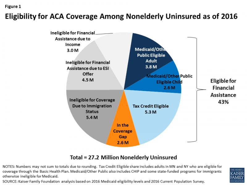 Nearly a quarter are either adults eligible for Medicaid (3.8 million, or 14%) or children eligible for Medicaid or the Children’s Health Insurance Program (CHIP) (2.6 million, or 10%). Those who are Medicaid eligible include people who were previously eligible as well as those newly eligible under the ACA.
