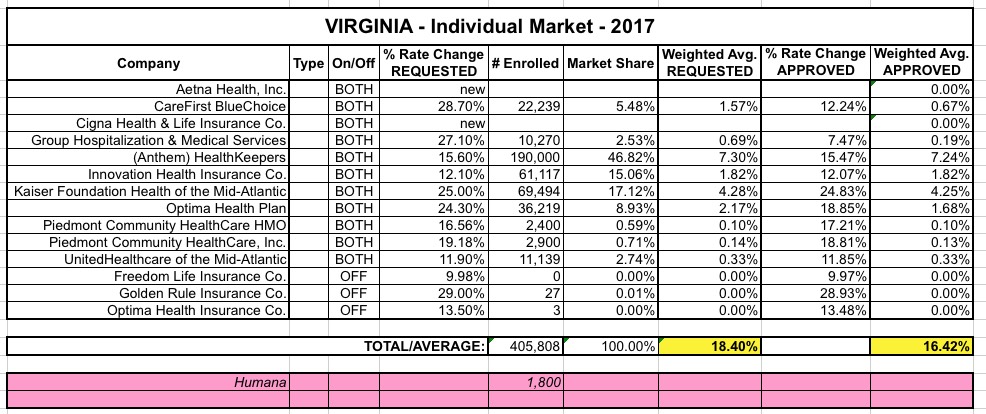 Approved Avg *Unsubsidized* 2017 Indy Mkt Rate Hikes for New Hampshire & Virginia: 8.8% and 16.4%