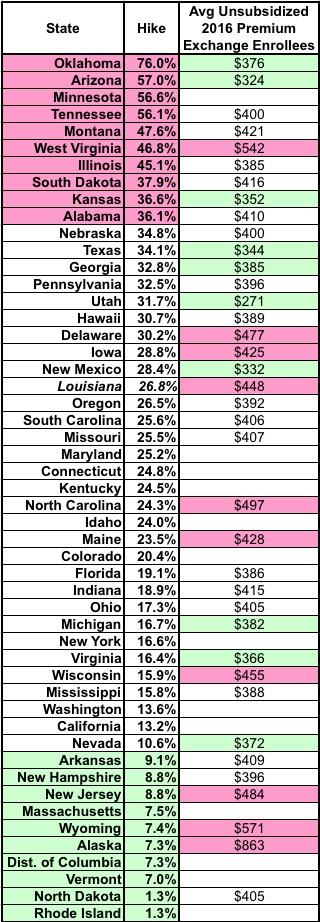As you can see, they kind of do so...but not really. West Virginia has among the highest premiums in the country this year but is still looking at a 47% average hike next year...and Nevada, which has a fairly low average premium this year is only looking at a 10.6% average hike in 2017.