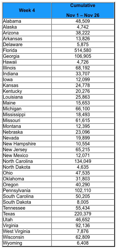 ...As in past years, enrollment weeks are measured Sunday through Saturday. Since this year Open Enrollment began on a Tuesday, the cumulative totals reported in this snapshot reflect two fewer days than last year’s Week 4 snapshot, yet enrollment exceeds last year’s total.