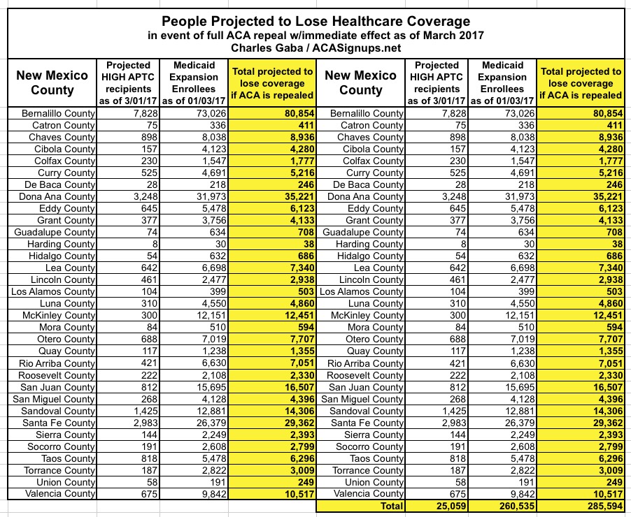 In New Mexico, assuming 57,000 people enroll in private exchange policies by the end of January, I estimate around 25,000 of them would be forced off of their private policy upon an immediate-effect full ACA repeal, plus another 260,000 enrolled in the ACA Medicaid expansion program, for a total of 285,000 residents kicked to the curb.