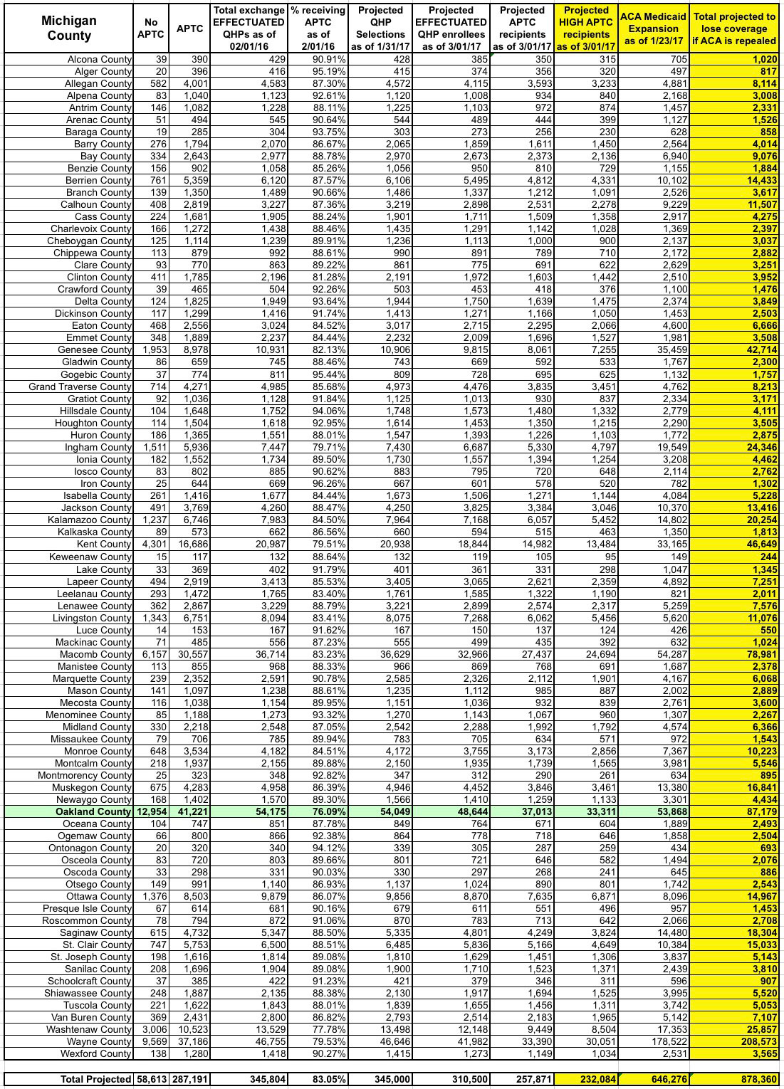 The other half is much easier: The "Healthy Michigan" website (that's our name for the ACA Medicaid expansion program) posts weekly updates of exactly how many people are enrolled by county...currently totalling over 640,000 people.