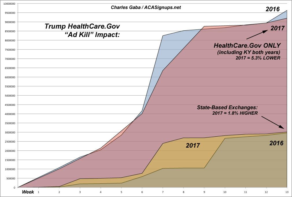 And then, in the final days of the in a one-two punch, Trump actively sabotaged the ACA by first signing an executive order instructing the HHS Dept. to do everything possible to impede the implementation of the law...followed by attempting to kill off the advertising blitz for HealthCare.Gov over the final, critical 5 days of the enrollment period. In the end, enrollment via the federal exchange (HealthCare.Gov) came in several percent LOWER than last year.