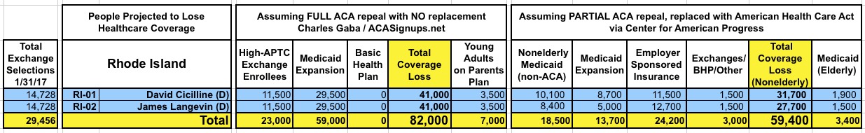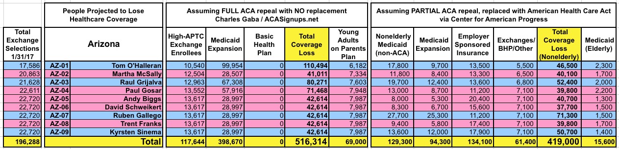 With that in mind, here's state-by-state tables comparing the projected coverage losses in all 435 Congressional Districts under either scenario: Full repeal with no replacement vs. partial repeal/replace via the Trumpcare bill. As you can see, the totals within each CD or state are considerably higher or lower in some cases...but the grand total still somehow ends up being roughly the same nationally.
