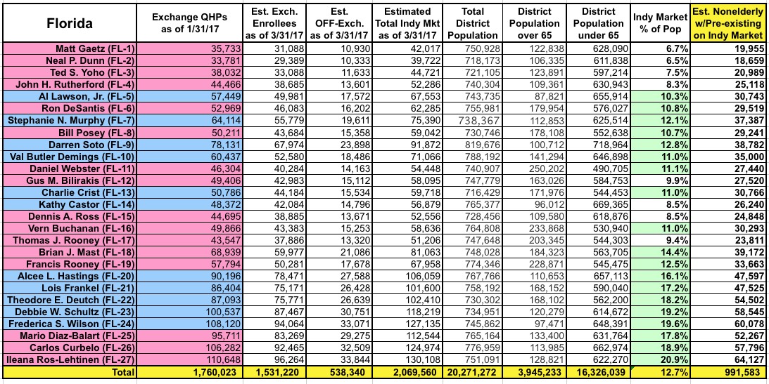 UPDATE 4/13/17: OK, I've now compiled the estimates for 22 states, and there's still only 4 districts outside of Florida where the total individual market cracks 10% of the non-elderly population, much less 15 or 20% (3 districts in California and one in Idaho). There's definitely something unusual going on with Florida's individual market size.