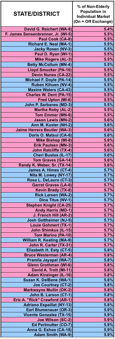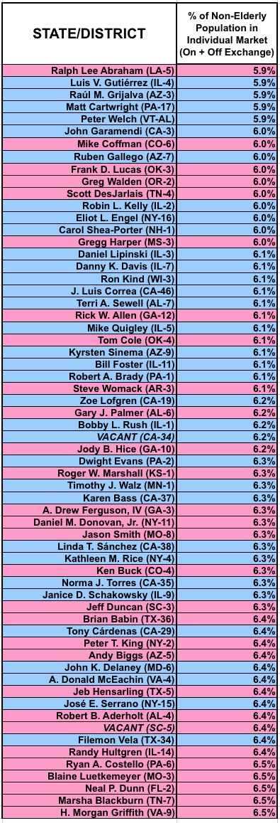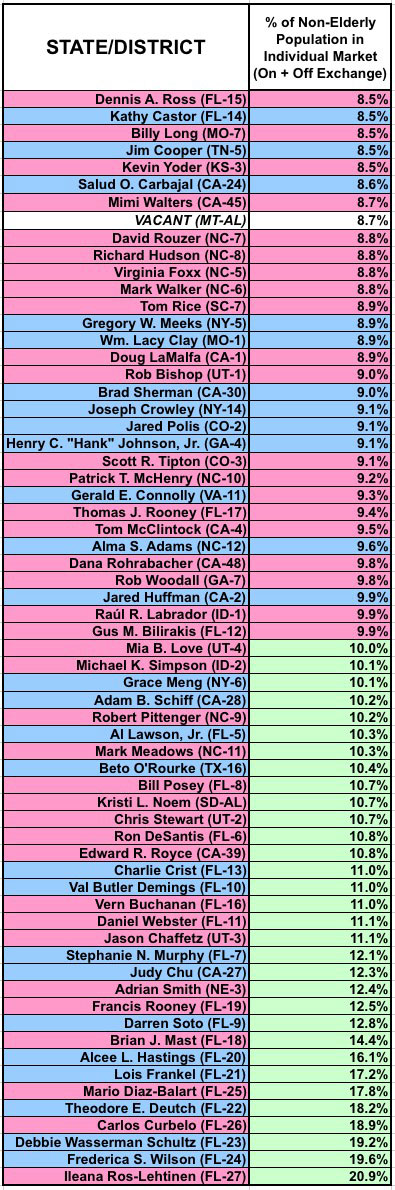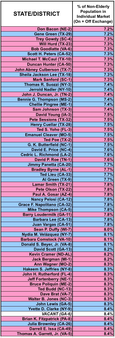 In additon to color-coding their data by the political party of each District's Representative, I'm also adding my own spin on the data: Estimates of how many people currently enrolled in the individual market suffer from "pre-existing conditions" which would likely mean them either being denied coverage altogether if the ACA's Guaranteed Issue, Essential Health Benefits and Community Rating provisions were to be stripped (Alternately, these people would charged massively higher rates to the point of likely not being able to afford the policy).