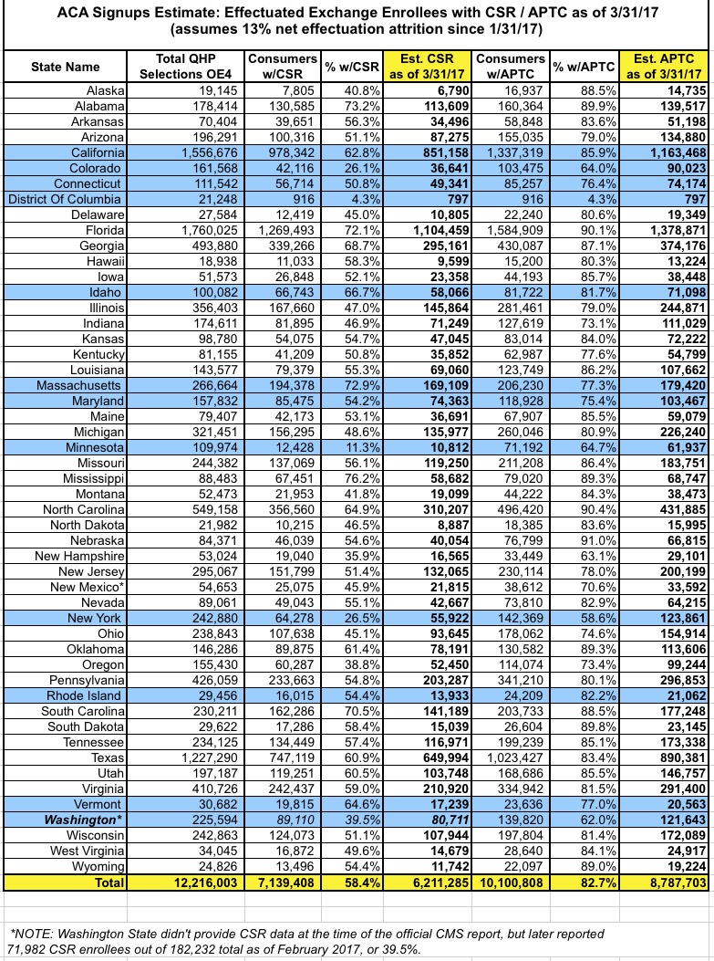 Here's a table breaking out the official APTC and CSR numbers for every state (NOTE: Washington State didn't include CSR data in the official CMS report for some reason, but later reported 72,000 CSR enrollees out of 182,000 as of February, or 39.5%. When adjusted to account for the additional enrollees whose policies started in March and then for nonpayment attrition, this should be around 80.7K today).