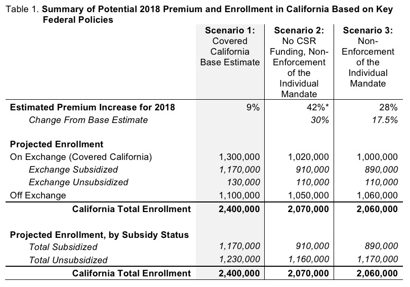 • California’s premiums could rise by 28 to 49 percent in 2018, and up to 340,000 consumers could lose individual market coverage if changes are made to existing federal policies.
