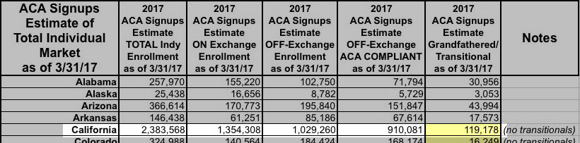 In other words, while I estimated grandfathered/transitional (GR/TR) plans at only around 10% of the total indy market, in CA it appears to be around 12.5%.