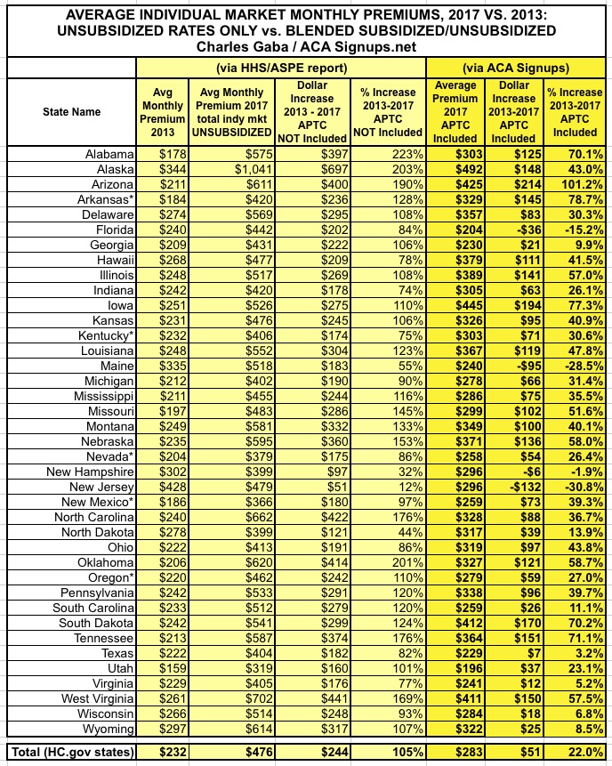 Their conclusion was that, across the 39 states covered by the federal exchange (HealthCare.Gov), average premiums have more than doubled, from $224/month in 2013 to $476/month in 2017...a 105% increase overall.