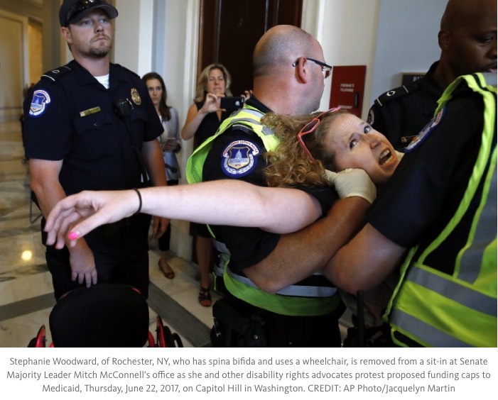 ...Initially, the demonstration was a relatively peaceful show of dissent, as a large number of protesters gathered outside of McConnell’s office to voice their anger, with some yelling, “I’d rather go to jail than die without Medicaid!” (McConnell was not in his office at the time of the protest, as he was introducing the health bill, while arguing it would “strengthen Medicaid.”)