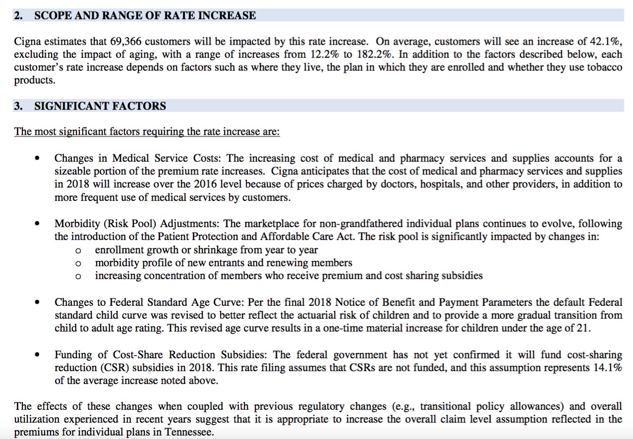 Cigna's filing hike request is a pretty ugly 42.1% overall...but they clearly state that a full 14.1 percentage points of this...or a solid third...is due specifically to Donald Trump and the Congressional GOP's threats to cut off the legally-owed Cost Sharing Reduction reimbursements due to the carriers. They also make a reference to Trump/Tom Price's threats not to enforce the individual mandate (by way of the increased morbidity profile expected for next year), but don't specifically break that part out. Without the CSR sabotage threat, however, they clearly state that they'd "only" be requesting a 28% increase (still ugly, but not as bad as 42%).