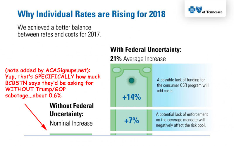 Yes, according to Blue Cross Blue Shield of Tennessee themselves, the one-two GOP sabotage threats to CSR funding and individual mandate enforcement are directly responsible for a jaw-dropping 97% of their requested premium increases for 2018 on the individual market.