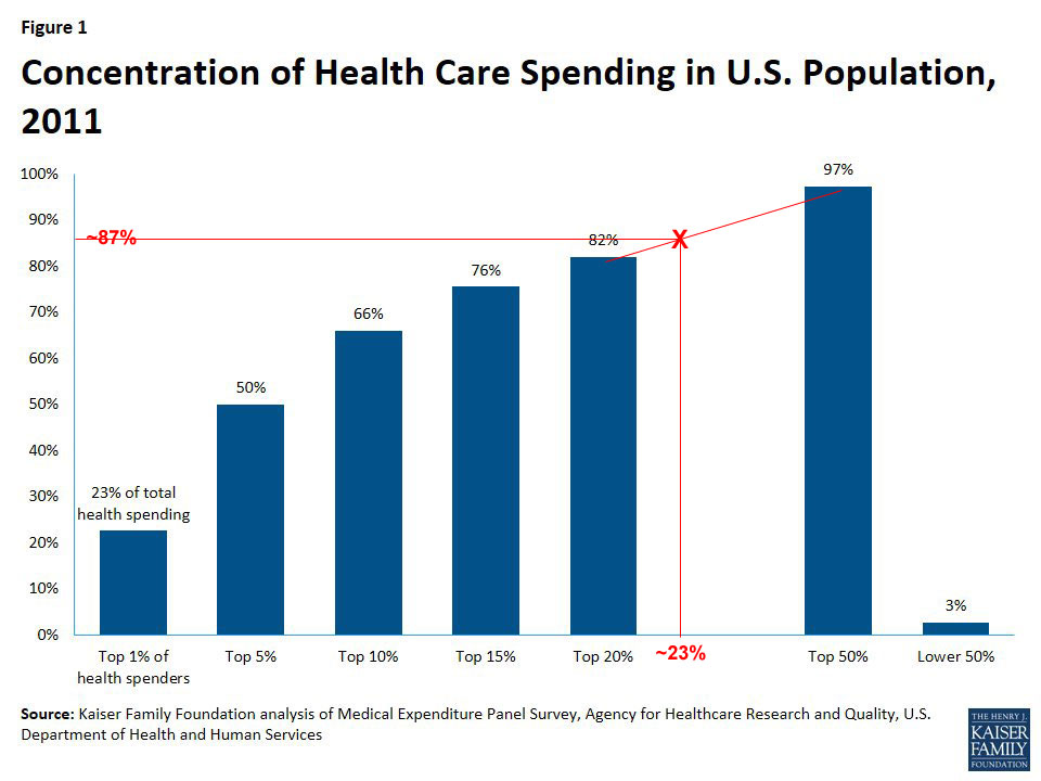 This is admittedly crude, but based on Kaiser's bar graph above, I'm pretty sure 23% of the risk pool uses roughly 87% of medical expenses, like so: