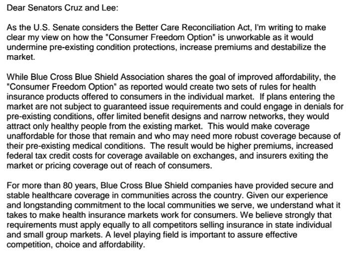 I should note that America's Health Insurance Plans and the Blue Cross Blue Shield Association, the two largest insurance trade groups, are appalled by the Cruz-Lee amendment: