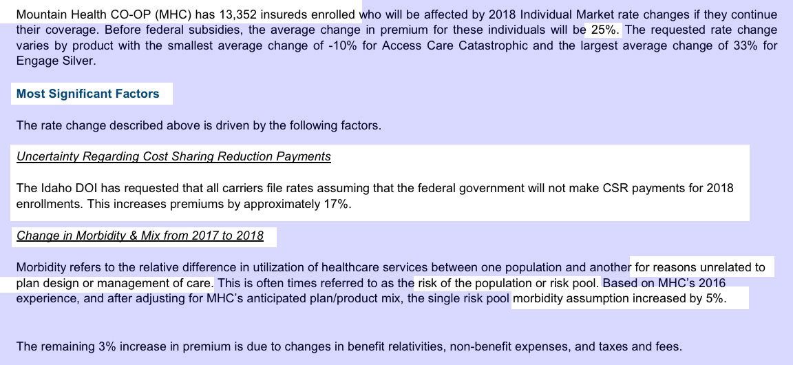 However, again, there's also the Mandate Penalty enforcement factor...listed in some filings as "increased morbidity" (that is, without the mandate being enforced, they expect fewer healthy people, therefore a worse risk pool). Regence BlueShield lists morbidity as being responsible for a whopping 18 points of their 46% increase request, while Mountain Health Co-Op has morbidity down at only 5 points. Other carriers don't really call out a specific number: