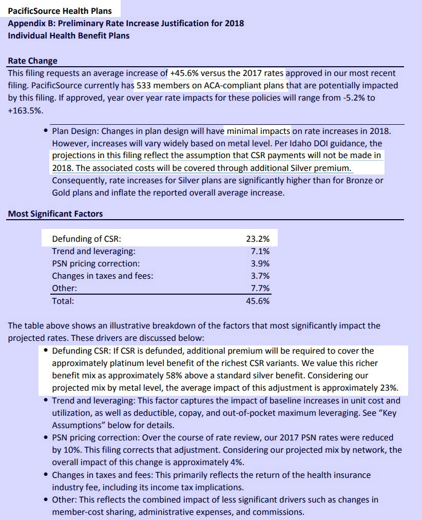 The proposed increases for Silver level plans on the exchange are significantly higher this year, even more than the increases for Bronze or Gold level plans, due to the potential refusal by the federal government to fund the Cost Share Reduction (CSR) mechanism. The CSR requires insurance carriers selling plans through Your Health Idaho to lower deductibles and out-of-pocket maximums on Silver plans for enrollees who earn below 250% of the federal poverty level. “I call on Congress to either repeal the CSR requirement or fund the program,said Director Dean Cameron. “That action alone would reduce the proposed increase by at least 20% on the Silver plans.” The premium requests for the Silver level plans reflect the cost of the CSR benefits since the carrier is still obligated to provide the benefits regardless of whether or not the program is funded at the federal level.