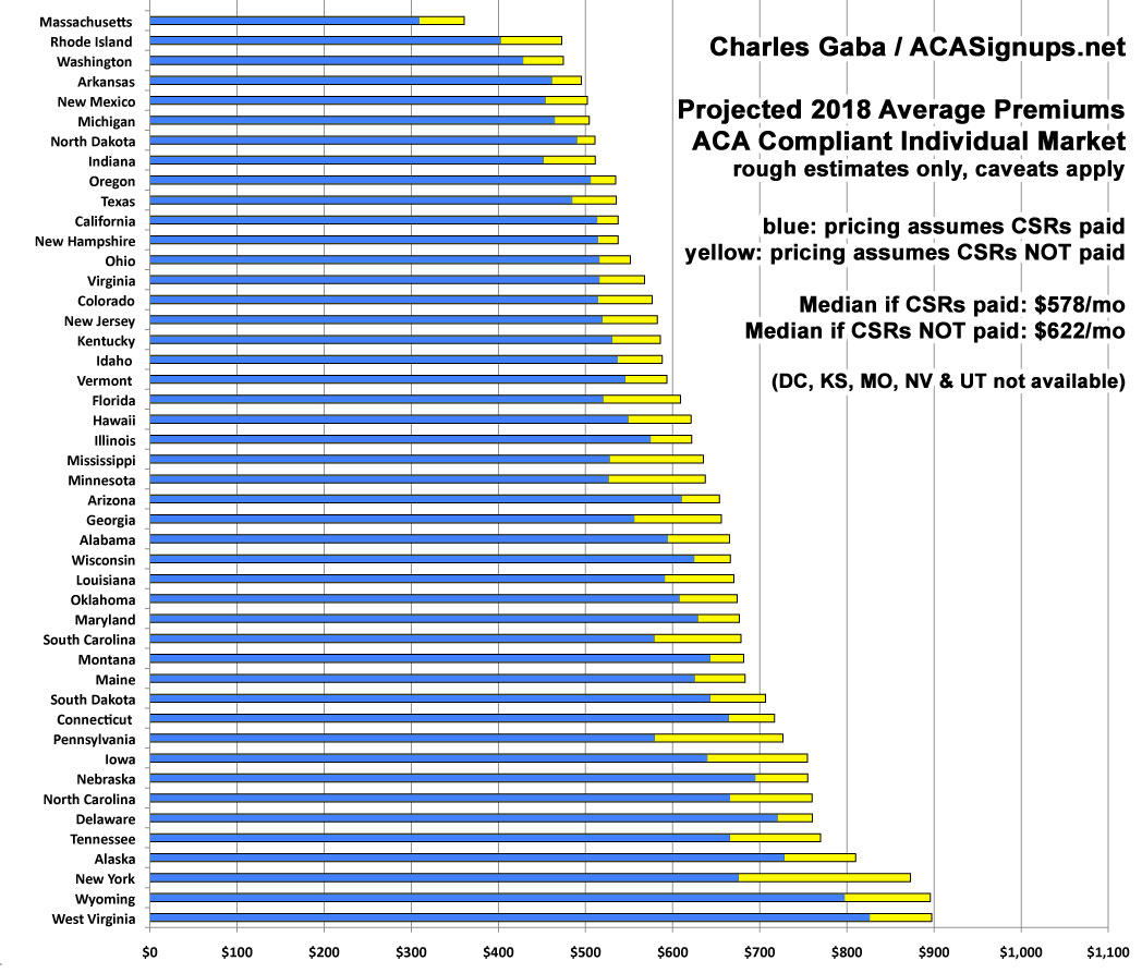 As far as I can figure, average unsubsidized (full price) indy market rates will range from around $360/month in Massachusetts to $897/month in West Virginia (if CSRs aren't paid). Between significant hikes in WV and Wyoming and the successful reinsurance program being implemented in Alaska, this means that for the first time in forever, AK won't have the most expensive average individual market insurance rates in the country (they should come in at either the 3rd or 4th highest depending on whether CSR payments are made or not).