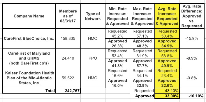 When I last checked in on Maryland's individual market rate hikes for next year, the picture was pretty grim: Overall requested increases of around 46%...and that assumed that CSR reimbursements are made in 2018. If you assume CSRs aren't paid, it looked even worse: A whopping 57% average increase statewide for unsubsidized enrollees. Ouch.