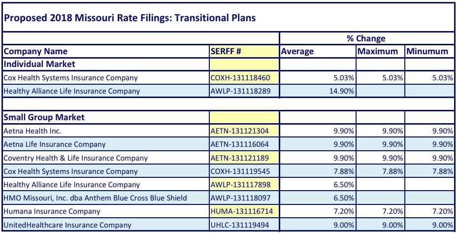 Normally I'd be pretty irritated by this, but to be honest, given what an utter mess the 2018 individual market landscape is shaping up to be, I can kind of understand this; the situation is even more fluid/confusing than ever, so I guess they figured there wasn't much point in posting the rate requests earlier than necessary if they're likely to change a dozen times before being locked in anyway. In any event, today the Missouri insurance department finally posted MO's requested rate changes for next year. This is kind of a big deal for the Show Me state, because until now, they were the only state in the country which didn't allow their own insurance commissioner to review rate hike requests.