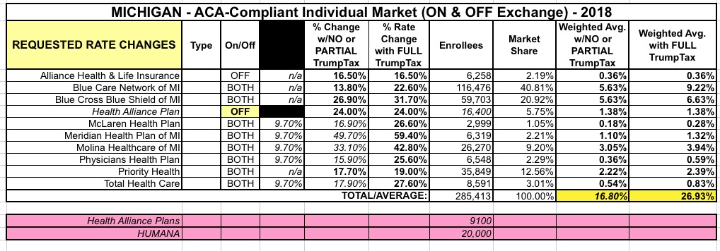 Just a few days ago I noted that Michigan's Dept. of Insurance issued the semi-final 2018 individual market rate changes for the 10 carriers offering indy policies in the state (9 of which are on the ACA exchange; one of them is only offering plans off-exchange). At the time, the breakout was roughly 16.8% average increases assuming CSR payments are made next year or 26.8% assuming they aren't made.
