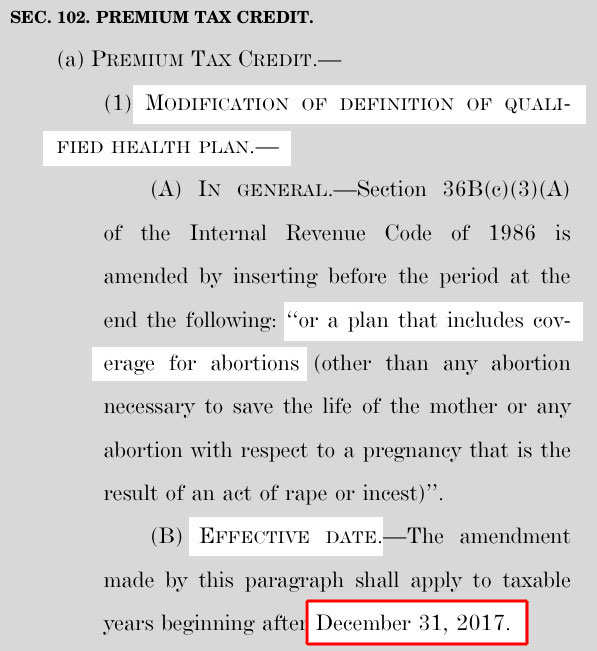 If the no-abortion provision popped up starting in 2020, it would suck but would also be pretty much moot since the premium tax credits are wiped out starting then anyway.