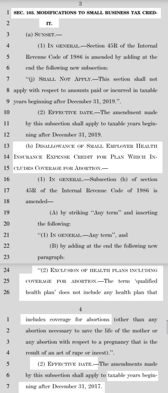 - Starting in 2018, amends IRC Section 45R to indicate that the term “qualified health plan” does not include any health plan that includes coverage for abortions, except abortions necessary to save the life of a mother or abortions for pregnancies that are a result of rape or incest.