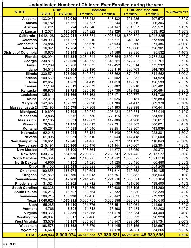 Here's a state-by-state breakout of how many children are enrolled in the CHIP program (as well as children enrolled in Medicaid), taken directly from CMS: