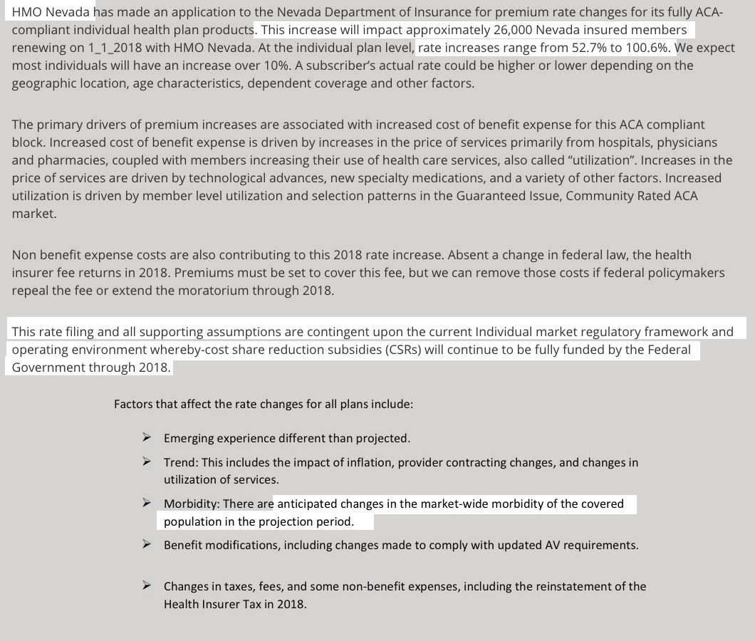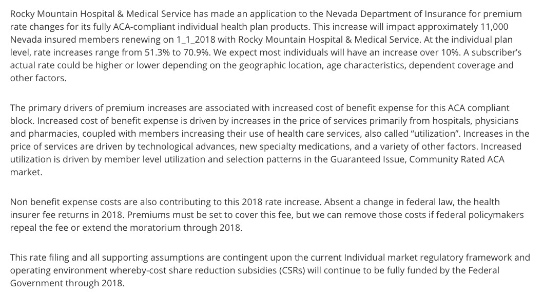 Four of the six individual market carriers are off-exchange only, so the CSR reimbursement issue is a non-factor for them. That leaves two carriers (Health Plan of NV and HMO Nevada), both of which seem to be operating on the assumption that CSRs will continue to be paid. This means that the 28.9% and 60.3% average rate hikes being requested by each would be around 10 points higher if CSRs aren't paid next year (spread across all metal levels), for an ugly statewide rate increase of either 37.8% with CSRs or 44.4% without them.