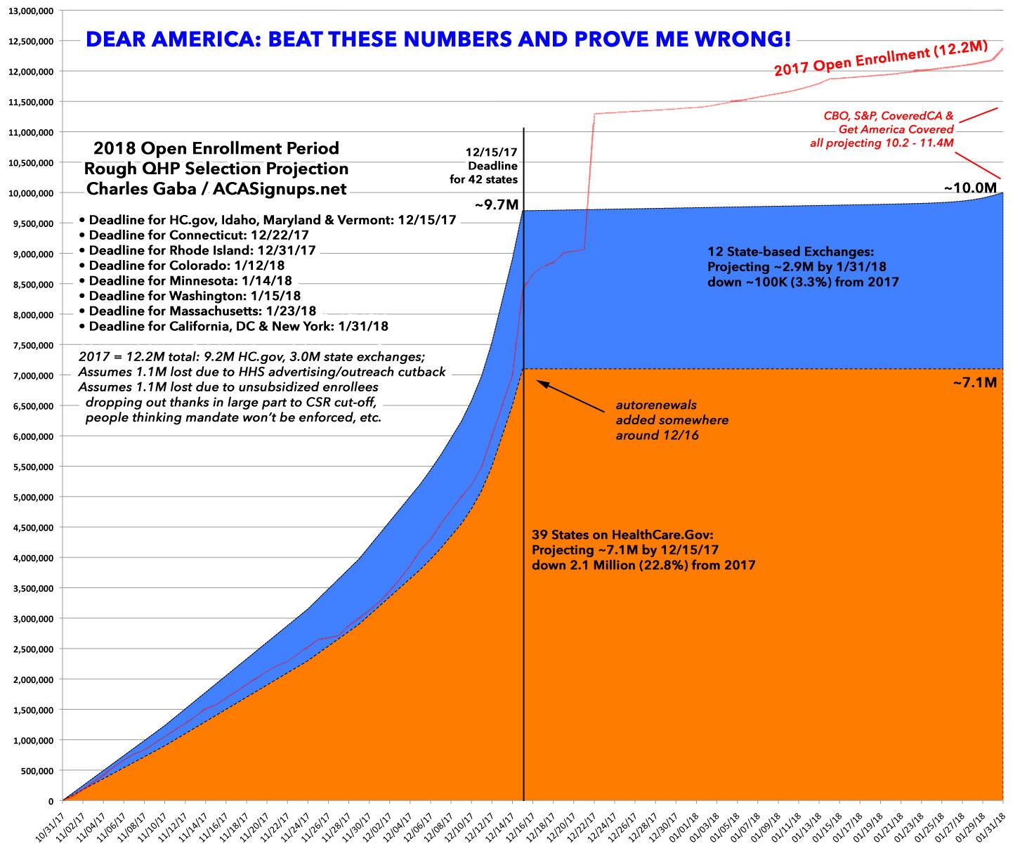 Last week I gave a very rough, back-of-the-envelope projection of perhaps 9.5 - 10.0 million Qualified Health Plan (QHP) selections during the 2018 Open Enrollment Period, which starts tomorrow. As I repeatedly emphasized, this wasn't based on any deep-in-the-weeds statistical analysis, because the one-two punch of the GOP's farcical "repeal/replace" efforts combined with the Trump Administration's "let Obamacare explode!" sabotage efforts have managed to botch things up so badly that I didn't see much point in expending the effort this year. Besides, others, such as Obama Administration Chief Marketing Officer Joshua Peck have already done part of this work for me: