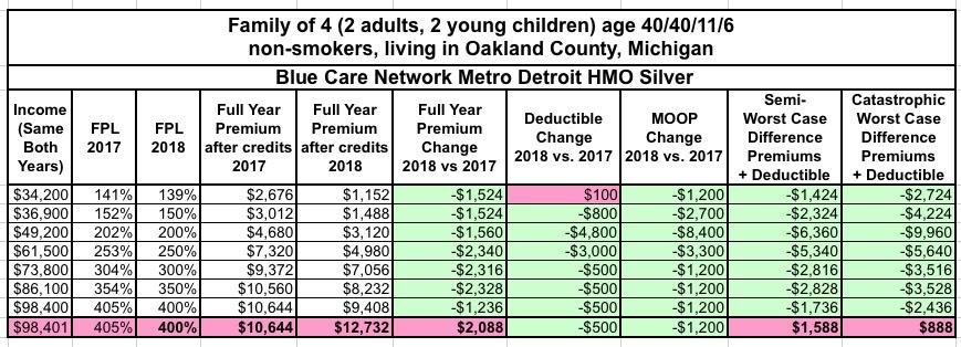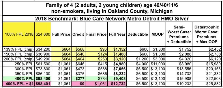 As you can see, for 2017, at the first three income levels, both children qualify for CHIP because Michigan's cut-off for the CHIP program is 212% FPL. The policy in question only applies to the two parents, who receive a substantial tax credit at these lower income levels. Furthermore, the family also qualifies for CSR assistance atall three levels (141%, 152% and 202% FPL), lopping their deductible down significantly at 141% and 152%, and to a smaller degree at 202% FPL. After that, it shifts to tax credits only (for all 4 family members), so they pay anywhere from $610 - $887/month depending on their income level.