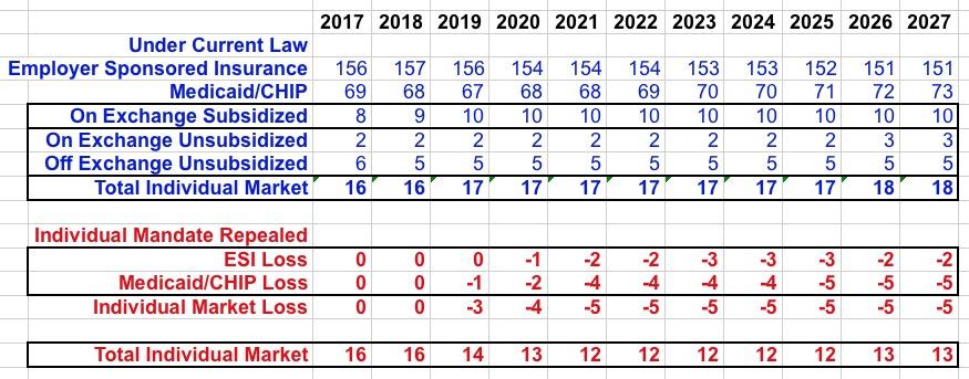 I asked Dave Anderson and Andrew Sprung about the ESI/Medicaid losses; they explained that some companies which are currently offering coverage voluntarily (with either fewer than 50 employees or with a lot of employees below the 30-hour threshold) would stop doing so because they'd no longer have to compete with the individual market. 2 million out of ~155 million or so is only around 1%, so this sounds about right.
