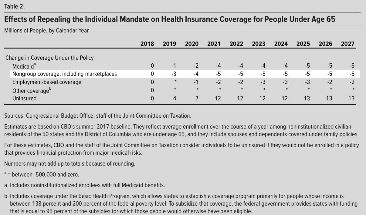 The Results of CBO and JCT’s Analysis CBO and JCT estimate that repealing that mandate starting in 2019—and making no other changes to current law—would have the following effects: