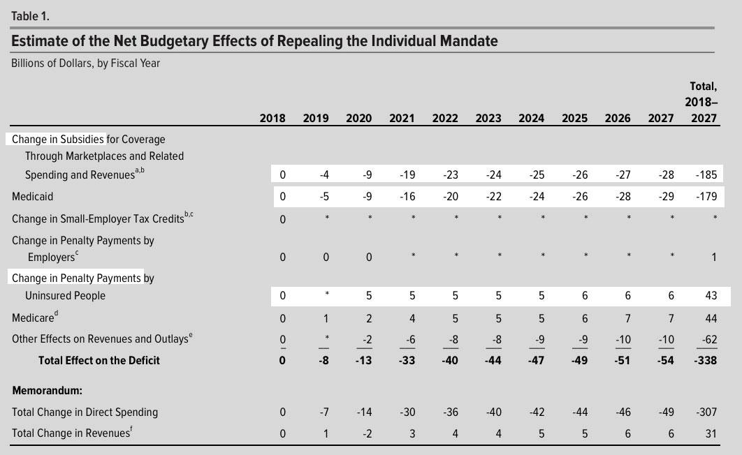 As I noted Wednesday morning, the Congressional Budget Office released an report with updated estimates of what they figure the budget and healthcare coverage impact of repealing the ACA's Individual Mandate Penalty would be over the next decade. Their conclusions?